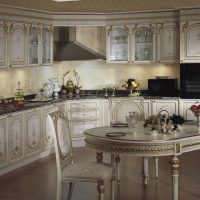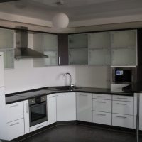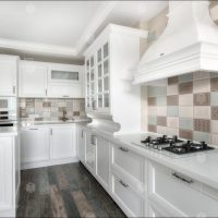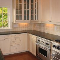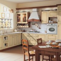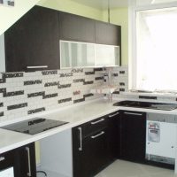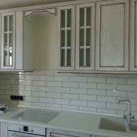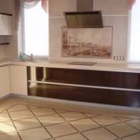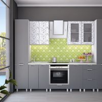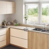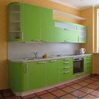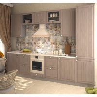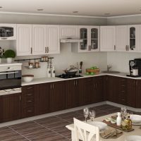 The kitchen set is bought in the color of the floor covering. Find a quality product with standard paneling. Ordinary straight doors are also suitable, but they will not look so beautiful.