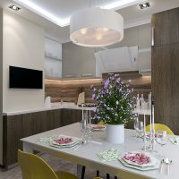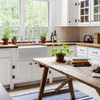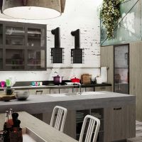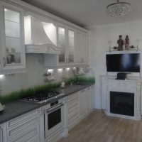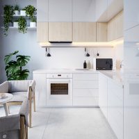 Purchase shelves the same as floor cabinets. Whiten the walls with a simple whitewash, or paint with white paint. On the perimeter of the desktop of the kitchen set, put vases with green plants. Since we have a double style - Provence, combined with the Scandinavian motif, white and green colors will be the best choice, fully characterizing these two directions. But in white, you can add a little beige, warm shade.