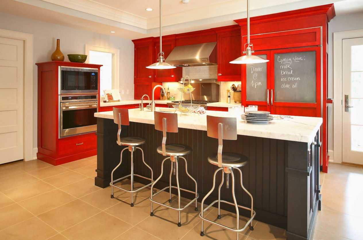 8. Traditionally, red cuisine is chosen by ardent, extravagant, passionate and loving natures. But with red it is easy to overdo it, especially when the shade is chosen incorrectly. Such a decision is well perceived in the "trio" with a white background and black contrast. The overall impression depends on the style.