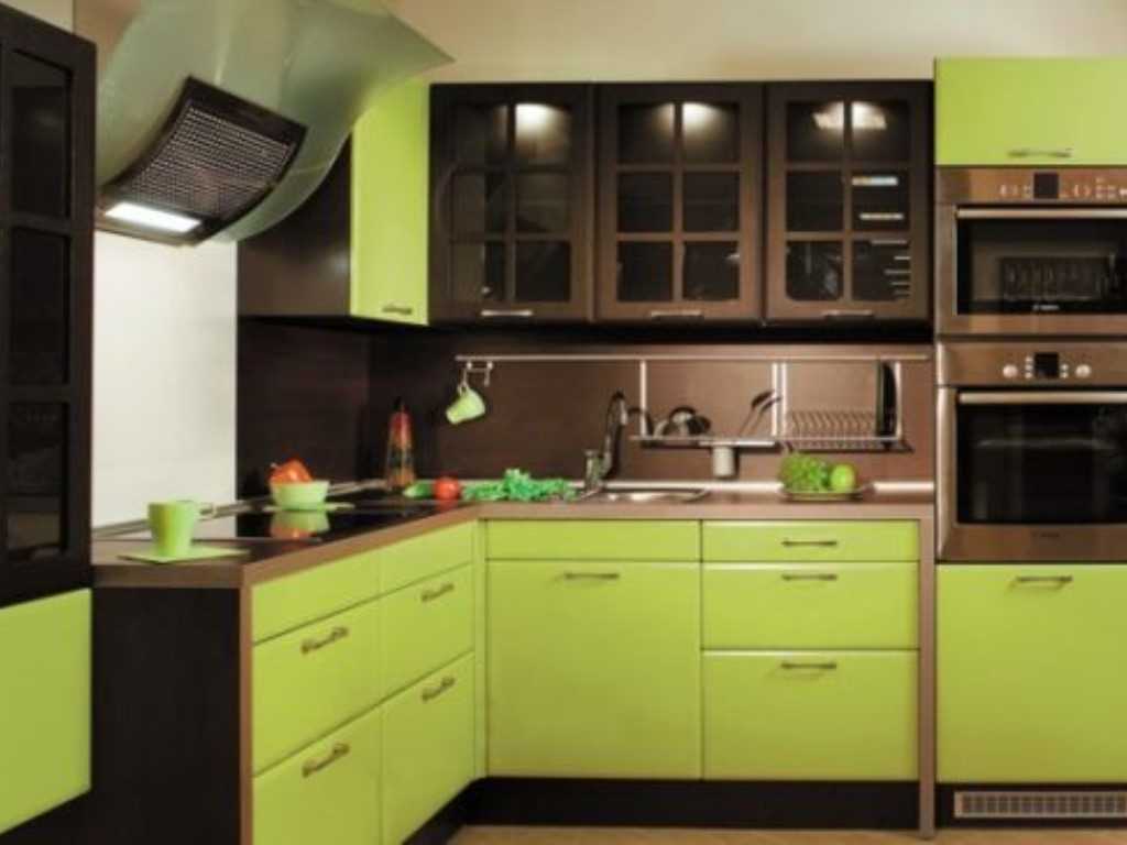 5. Eco-cuisine in green is the traditional choice of those who value everything natural. It is recommended to use natural wood in furniture and imitation of natural stone in the flooring. Photo prints on furniture facades, decorative inserts or large drawings will be appropriate. Still life is chosen for the classic setting. For modern styling it is better to choose computer graphics in a frame or digitizing images of dishes, drinks or fruits.