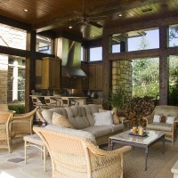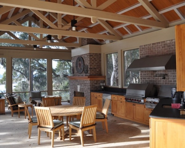 The summer kitchen is still closed, this building is a separate small house. The closed house has full roofs and walls with windows and doors. The main advantage of a closed house is its convenient design, protected from rain and bright sun. In summer, the building is used both as a kitchen and as a separate guest house. This construction is constructed from a material such as brick, foam concrete block or cinder block, and lining, drywall and sometimes plywood are used here for interior decoration, as you can see by looking at the photo of the finished building.