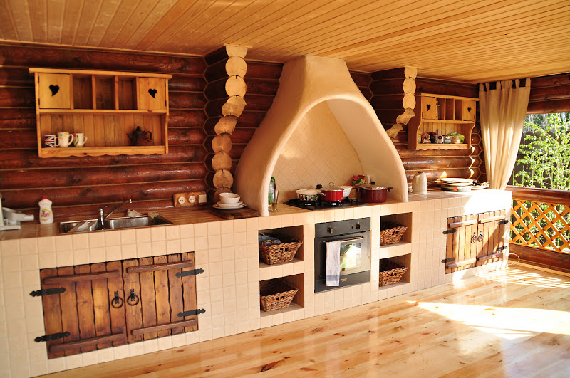 The traditional style of this country kitchen is a rustic setting, for which clay dishes and textiles are used. Artistic tone and family style will make a large Russian samovar, located on a wide dining table. It is recommended that only wooden furniture be installed here, and the decoration is best done with a material such as wood. If this kitchen is built and equipped correctly, then there you can cook dishes in the spring, and summer, and autumn, as well as in winters, if they are warm.