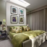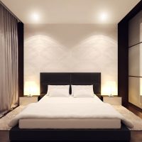 The modern style combines neat and reliable furniture without an abundance of decorative elements, monophonic wall and ceiling coverings in a gray, white or beige palette. It is worth avoiding dark shades, they are more suitable for large bedrooms. The visual expansion of the space will help the elements that reflect light: metal objects, chrome handles, polished wood, mirrors, etc. You can dilute the restraint of design with accents in the form of paintings, floor lamps, indoor plants.