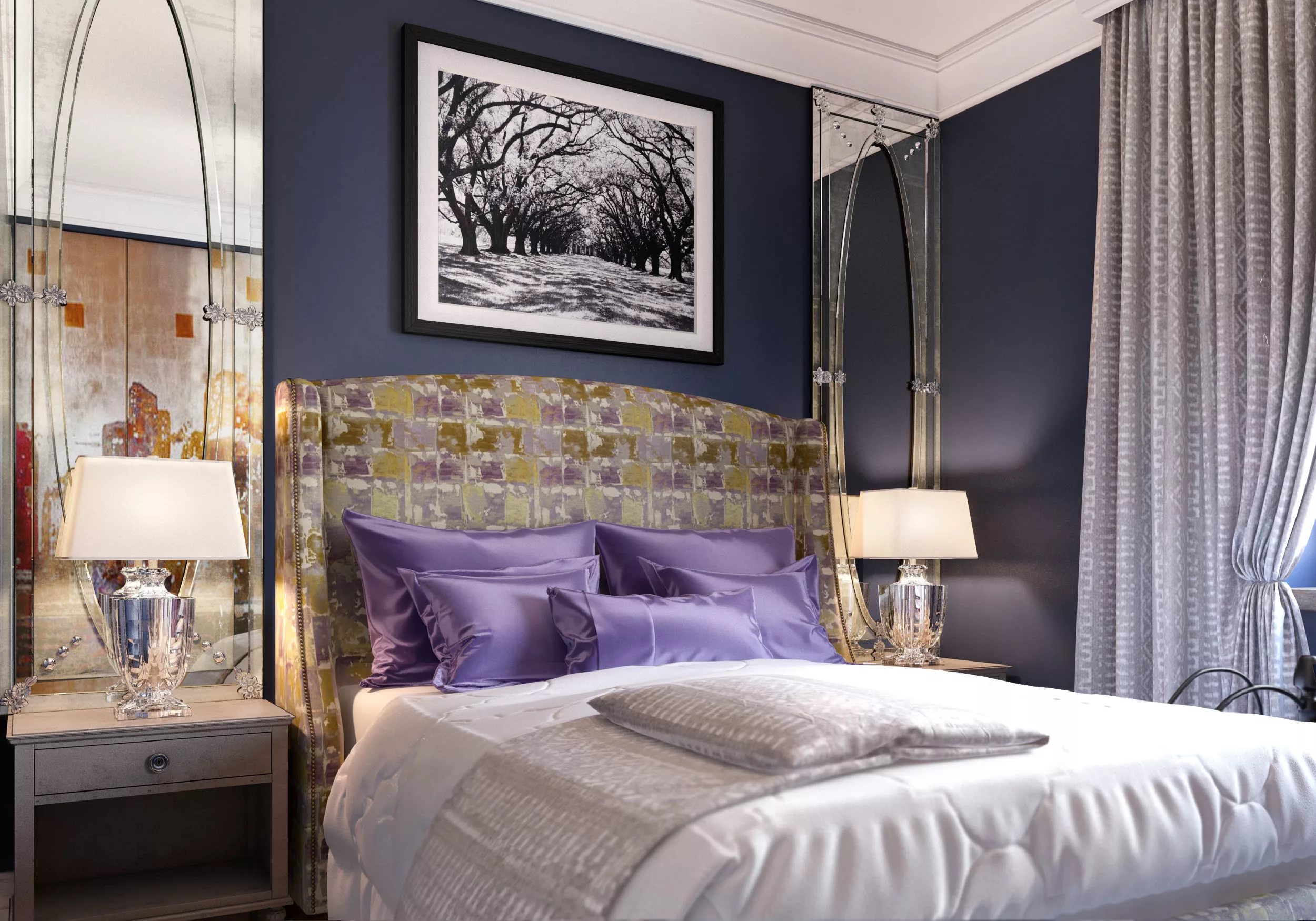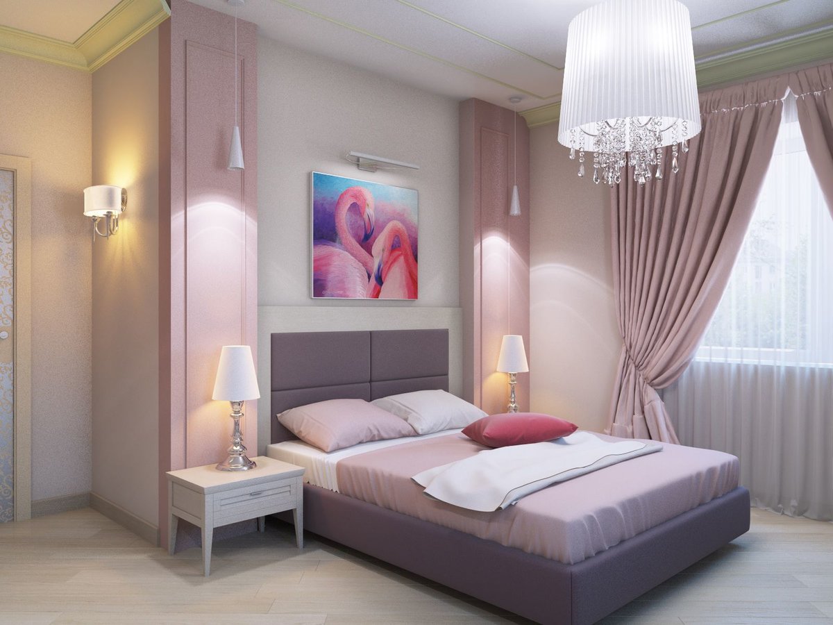 Violet tones are soothing. Association with the color of sunset will prepare the body for sleep. The interior in this color is at the same time calm, soft and stylish.