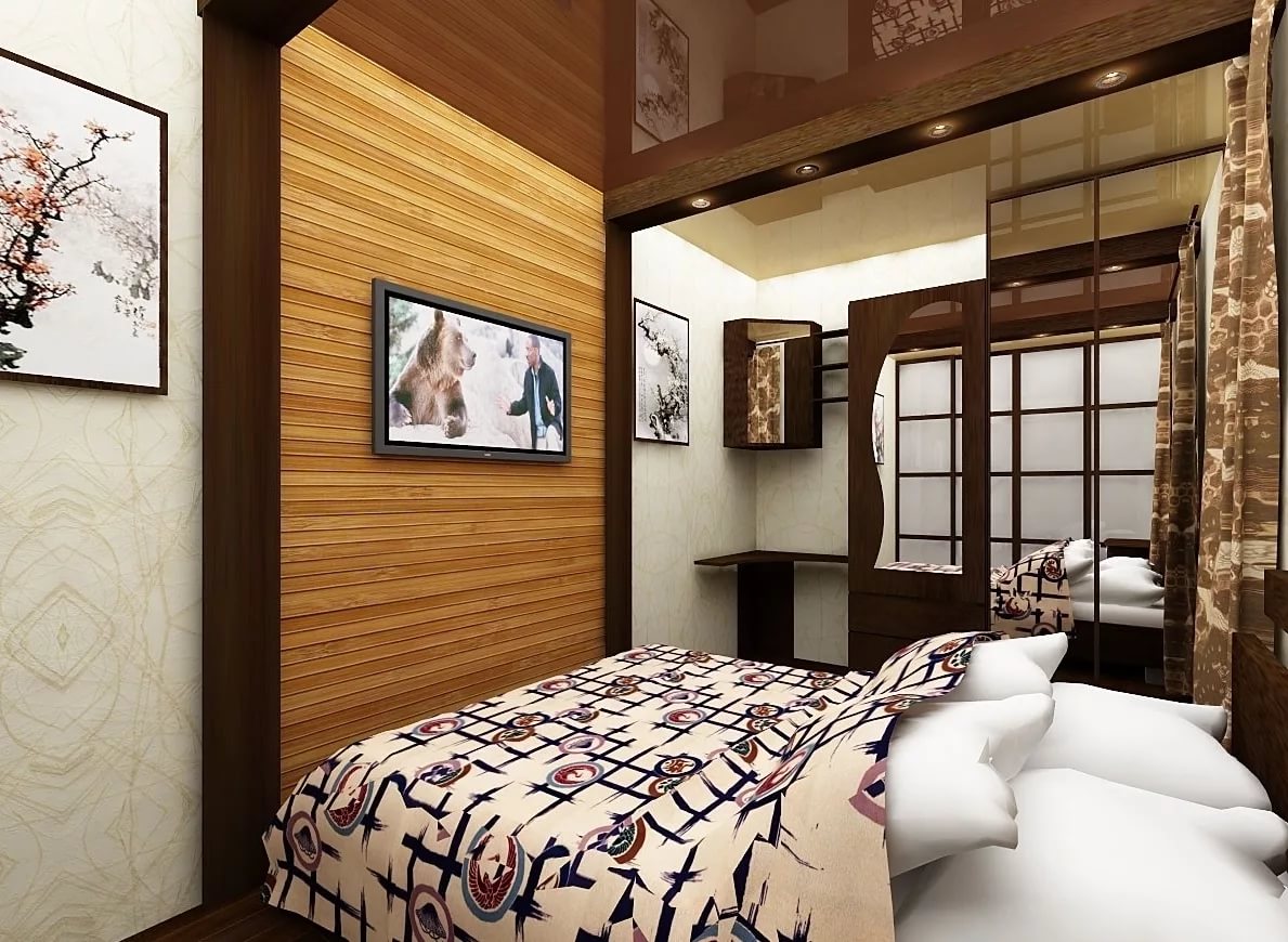 2. A narrow (rectangular) small room. Such a layout can be visually balanced by gluing photowall-paper with volumetric perspective on one wall and installing a cabinet with a glossy surface on the opposite. A narrow room can be expanded with horizontal stripes on the wallpaper, or for the option to be functional, it can be long horizontal shelves.