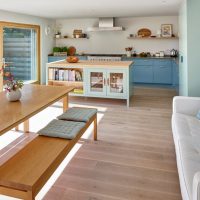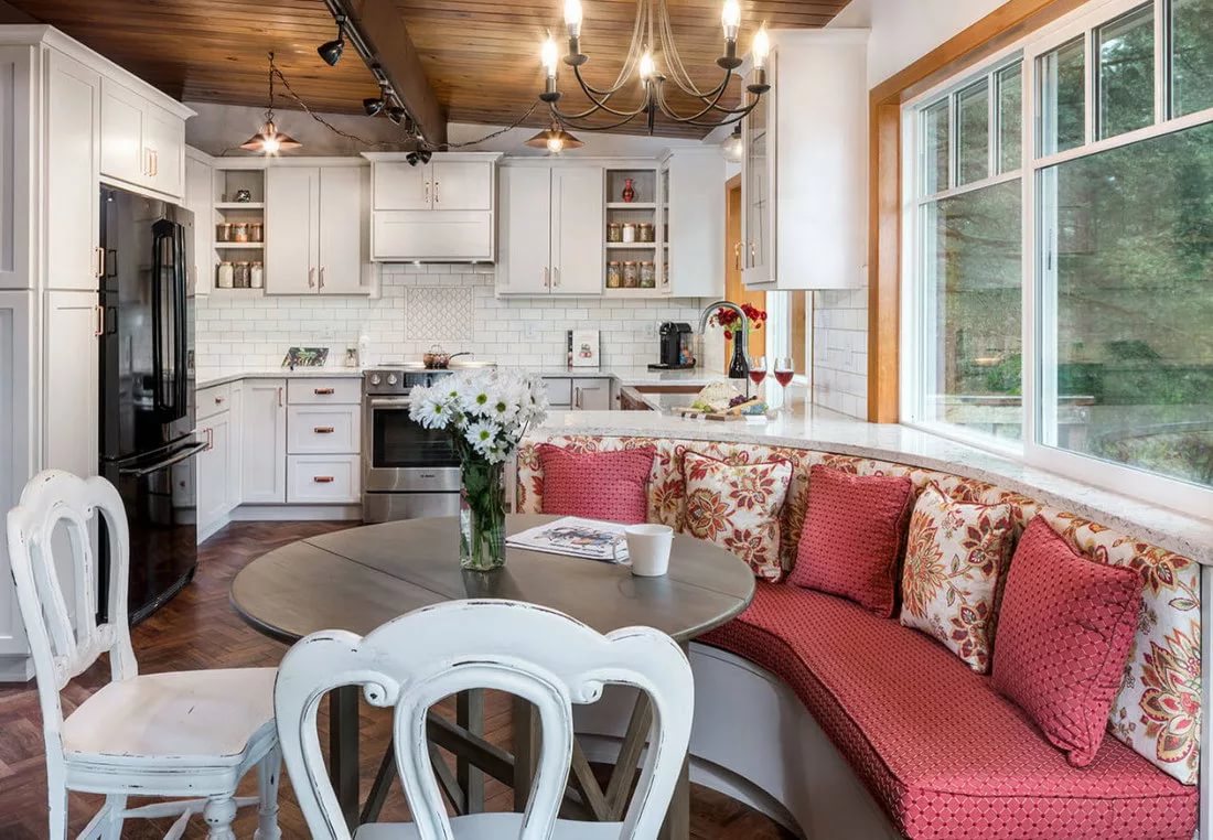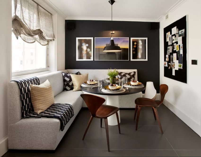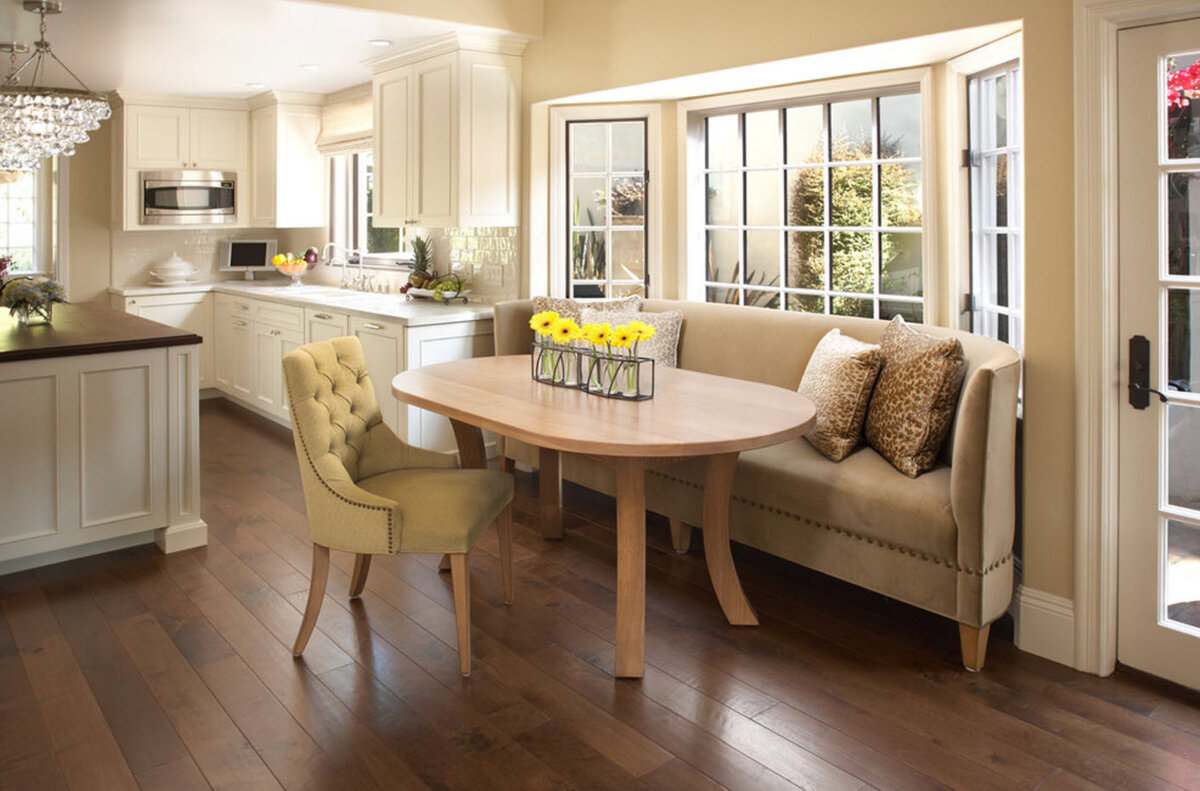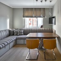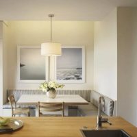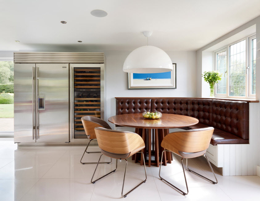 The location of the sofa depends on other furniture, the geometry of the kitchen, as well as the purpose. It is considered ideal if it will stand against the wall in the L-shaped form. In this case, you can put a table opposite. In tiny kitchens, sofas should not be placed. In some cases, it is better to choose a product without corner blocks. In a room with a large area, the sofa does not fundamentally combine with a table, since it can take a place in the recreation area.