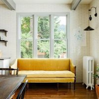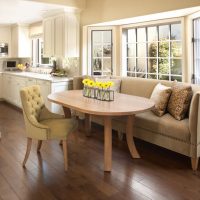 A traditional direct-shaped sofa can be put in different places. It looks presentable. The main thing is to achieve harmony and symmetry of the room. However, it occupies a large area, and is not rational for small kitchens. This design has no more than 3 seats.