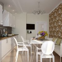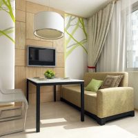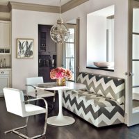 Such an interior allows a model of any design. It can be a straight shape or with bends. The material does not really matter. Practicality comes first. Designers recommend light monochromatic shades that resonate with curtains or other elements of the room.
