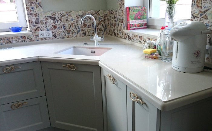 - Resistance to chemical attack. During cleaning, sometimes too aggressive substances are used that can spoil the surface of the countertop made of chipboard or wood. Agglomerate is not exposed to the negative effects of chemicals. Neither acid nor solvent will harm the countertop.