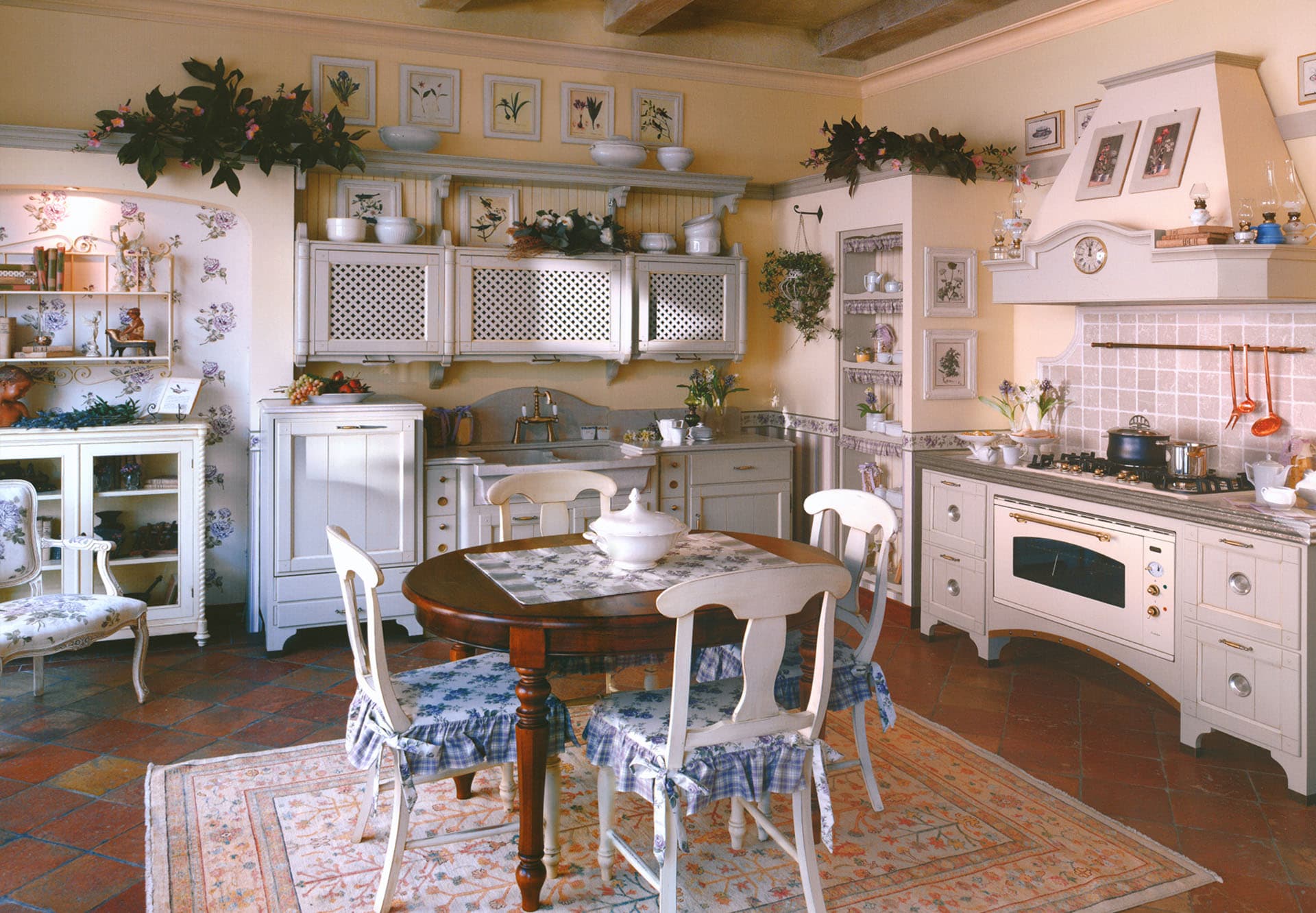Furniture, room decoration should always be in bright colors, everywhere floral patterns, pots with plants, ruffles, delicate curtains, lots of dishes, glass.