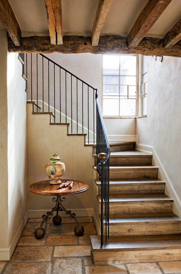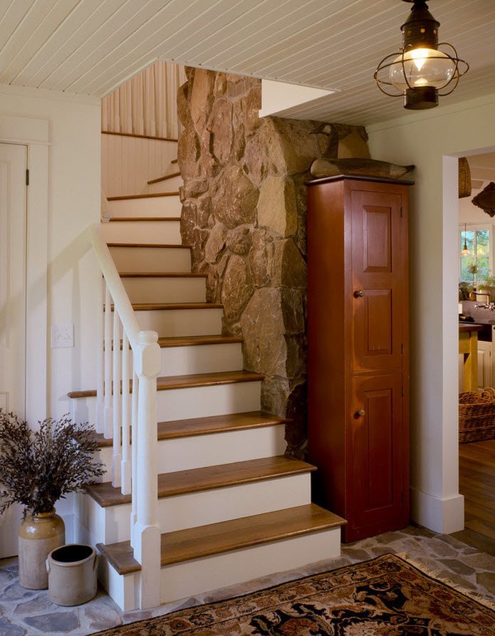 A decorative staircase in the interior of the house will be an excellent solution for a room decorated in a country. These functional wooden models allow you to place a cabinet or convenient niches under them; they store various things. This direction provides for a large number of textiles.