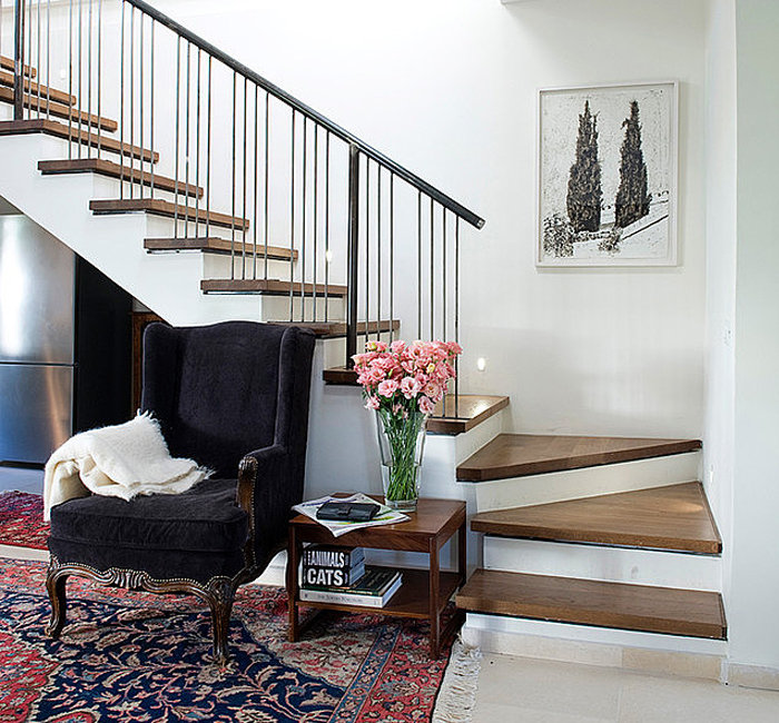In the living room it is placed in a corner or along the wall. A staircase acts as a partition, dividing the room into sections. In the space underneath it is placed equipment, paintings, create recreation areas. Buy a finished version of wood or make an individual order. Modifications with mirror or glass inserts look interesting.