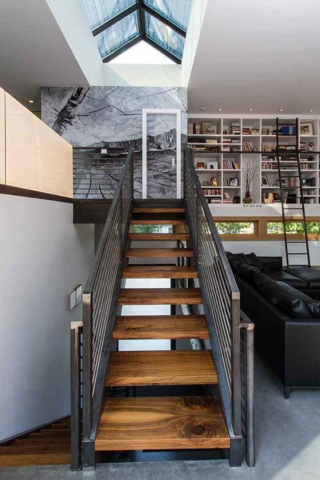 Luxury staircase on a metal frame with wooden steps.