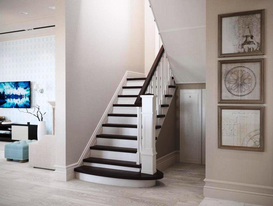 For spacious apartments, they acquire a massive staircase and decorate it with balustrades. The design of the hall corresponds to the selected type. It is worth taking care of the lighting, acquiring a central chandelier, installing additional appliances at the entrance. The staircase will be a logical continuation of the design of the hall. Its geometry, colors are traced in the design.