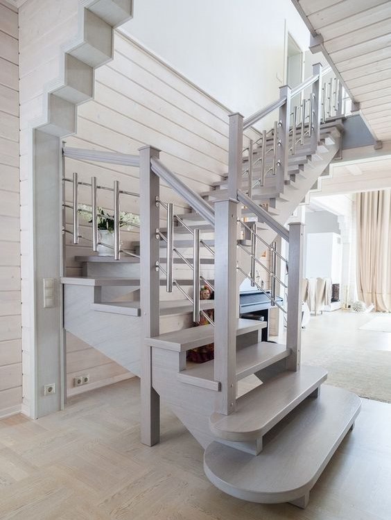 Practical corner staircase that fits perfectly into the interior of a wooden house