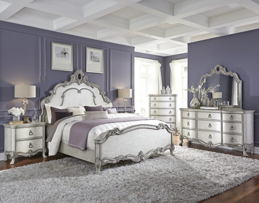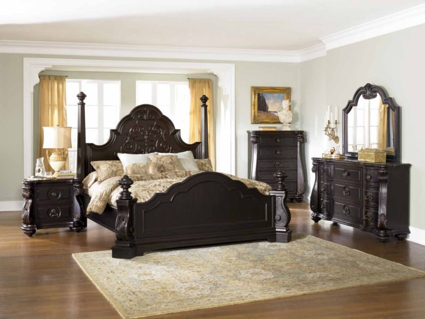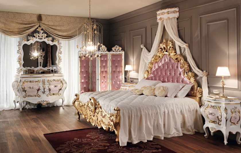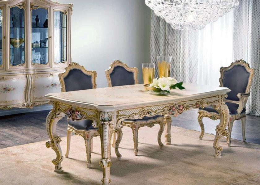 Furniture items are decorated with carvings, as well as inlaid with gold or wood.