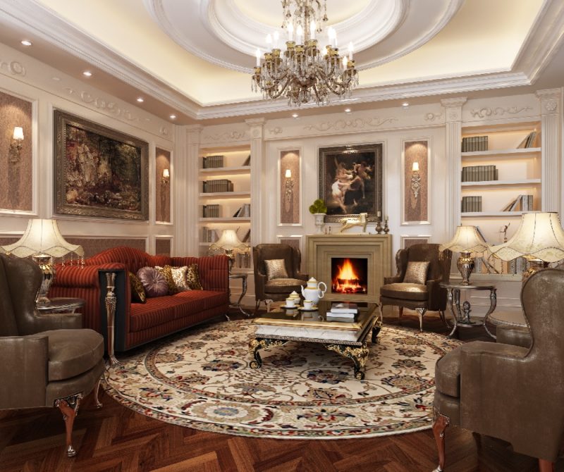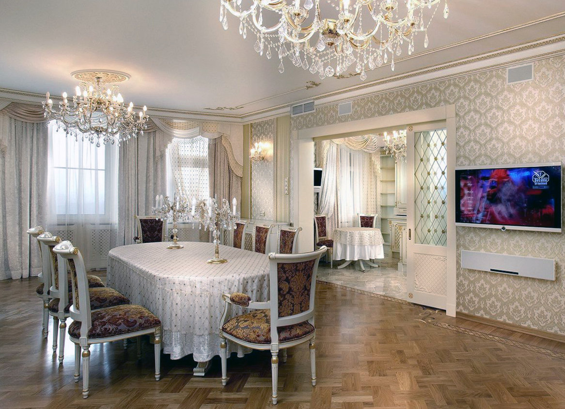 - Finish.In the antique style, thinking over the interior decoration implies not only the choice of materials that are supposed to be applied to the floor, walls and ceiling. Along with this, it is necessary to consider the location of decorative details. For example, walls in this style are almost always decorated with moldings, cornices, pilasters and so on.