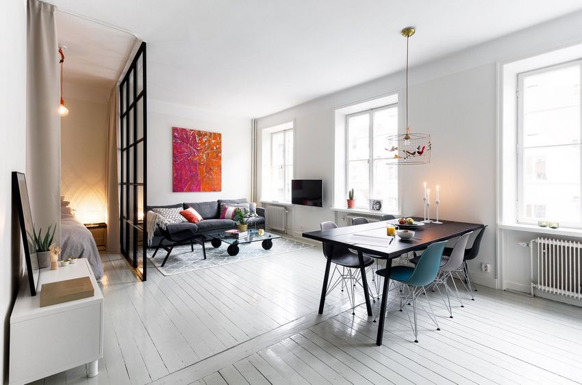 Partitions in the form of curtains are often used in interior design in the Scandinavian style.