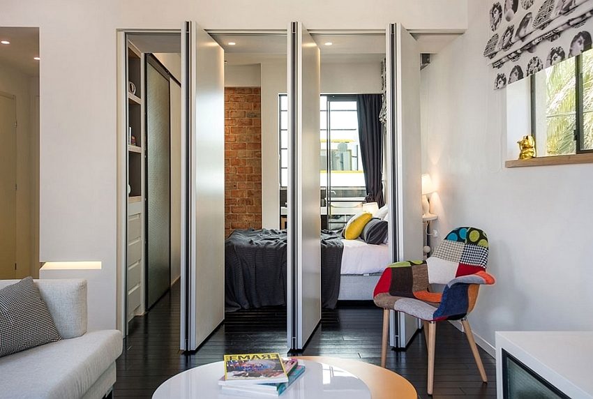 The accordion partition is easy to fold for a day, and in the evening also quickly divides the room into functional zones