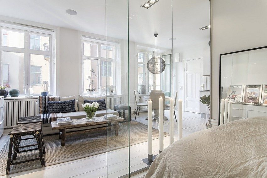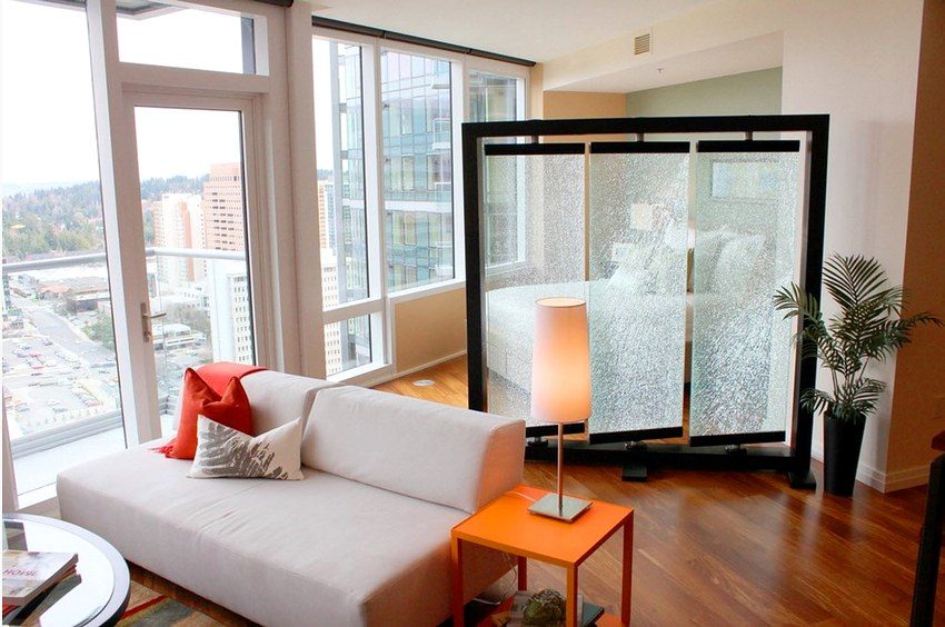 Area, style features often require the use of light, almost invisible materials for zoning a room. This can be called glass. It has a number of undeniable advantages: