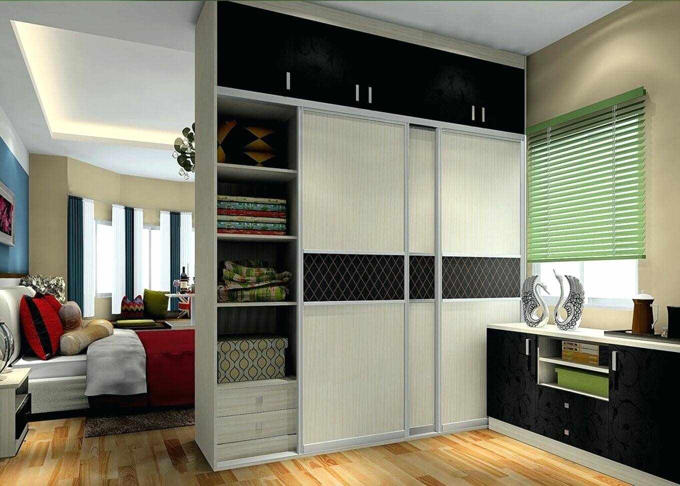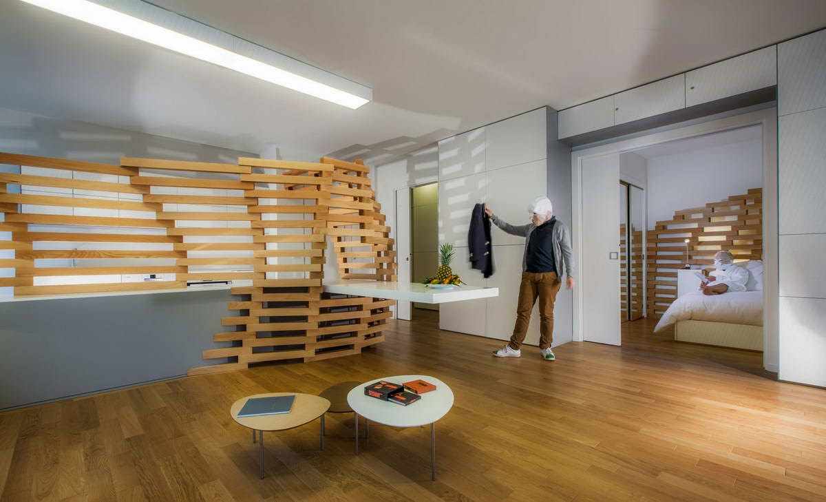 Mobile compartment doors and sides can move along the same line (guide rail using rollers). Less often they use modules rotating around their axis, as in the photo of unusual partitions in the interior of a studio apartment.