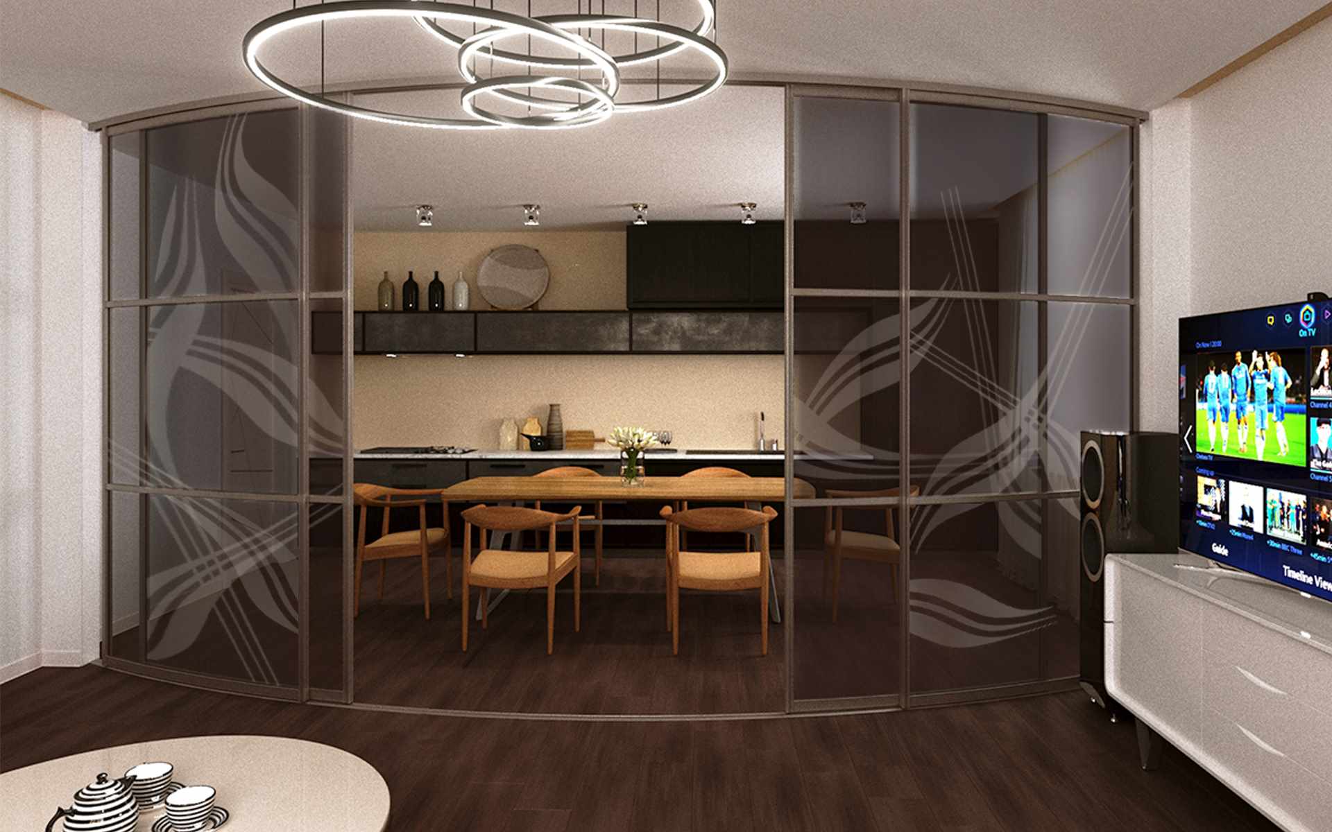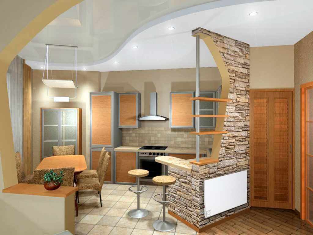 - Instead of a wall, between the kitchen and the dining room, they use a bar, a rack for dishes or a hanging plasma panel that can rotate, depending on the location of the owners.