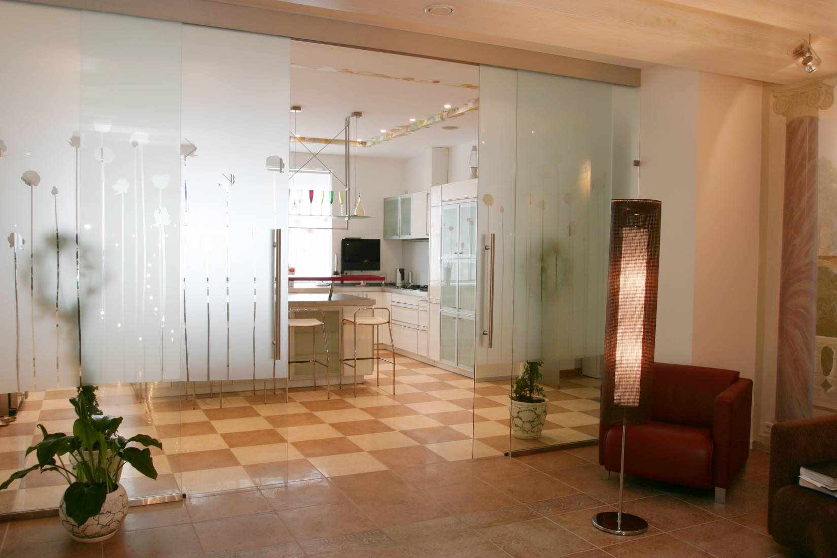 Important! Ordinary glass is not suitable for a decorative barrier in a living room because of its fragility.