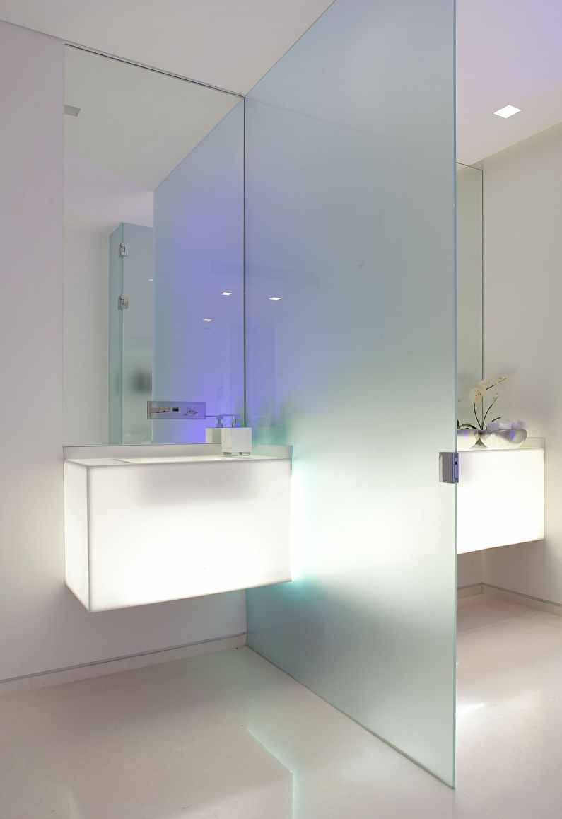 - In the interior of a large bathroom, glass partitions and a glass block barrier remain relevant.