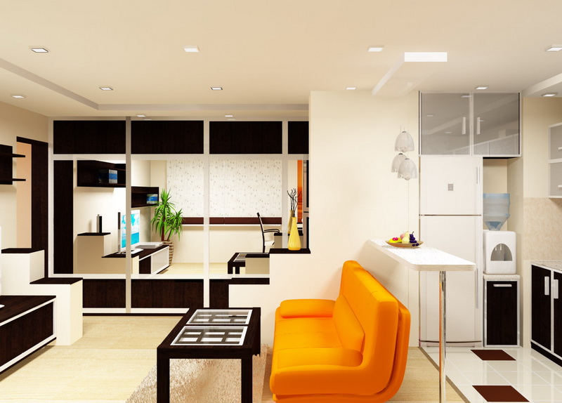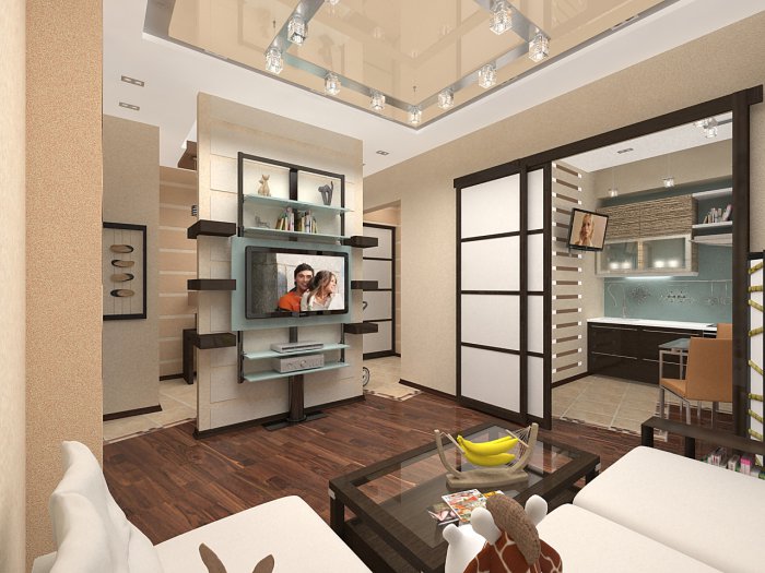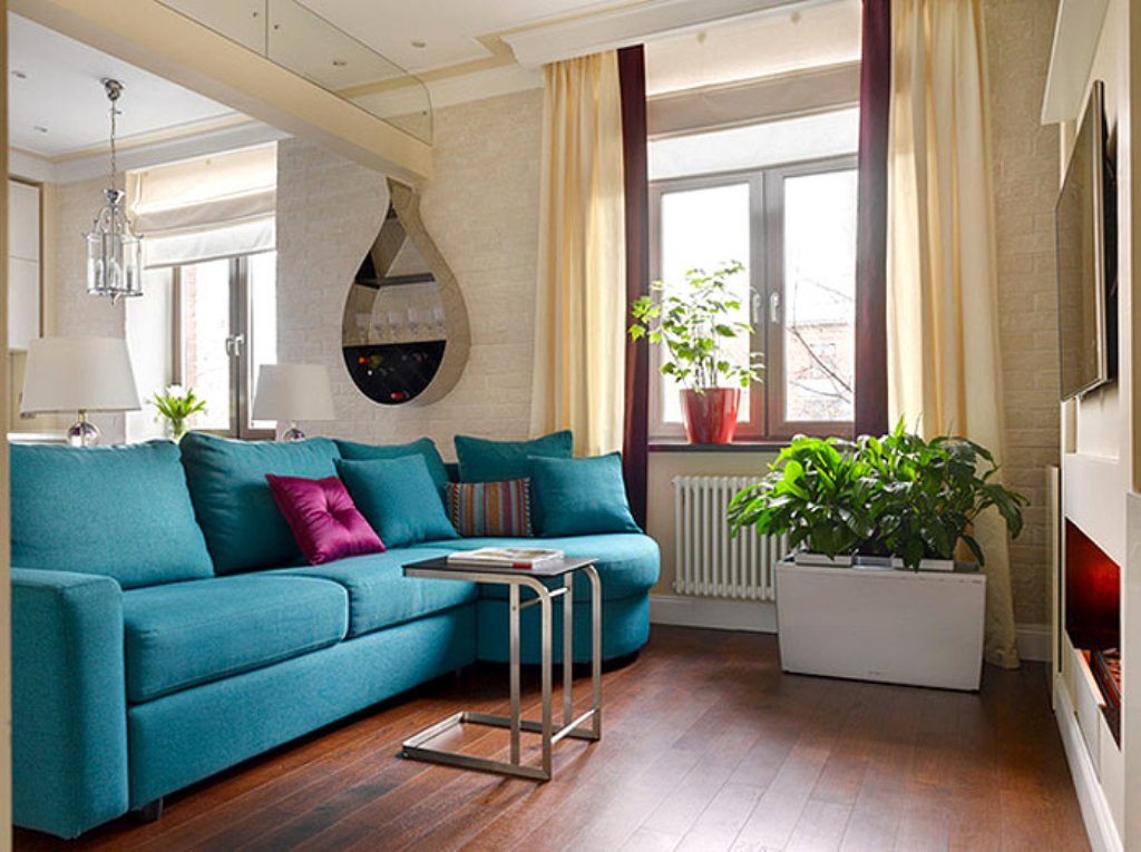 Design 1 room apartment in Stalin by removing partitions, turn it into a studio apartment. The walls can be leveled with drywall, having processed it with putty. Old plaster is best removed because it causes a bad smell, a hotbed of bacteria, mold. The ceiling can be leveled with putty or by installing a stretch ceiling.