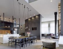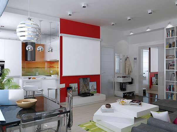 The lack of physical boundaries will increase the space, and properly selected lighting to delimit it into functional areas.