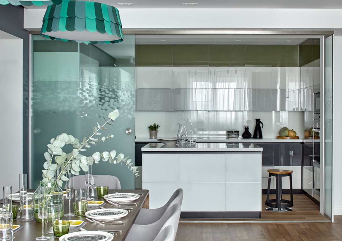 Due to the absence of massive partitions and walls, the apartment visually seems larger and does not create a feeling of isolation.