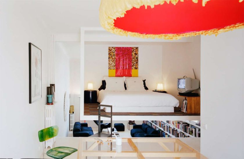 The bedroom is separated from the rest of the space by a curtain, while being a continuation of it.