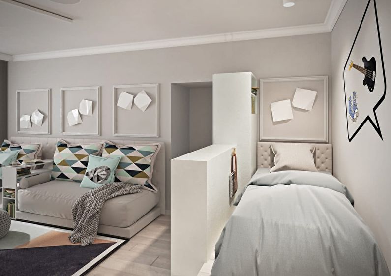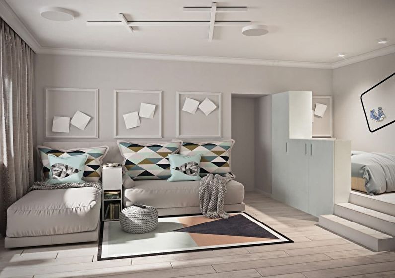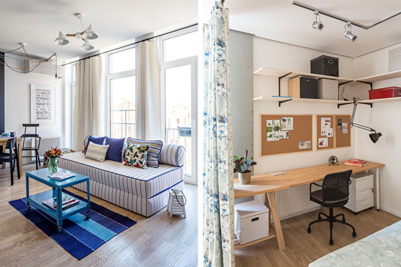 Proper zoning of the room with the help of curtains, partitions of different heights and functional furniture will help to divide the area so that there is enough space for everyone.