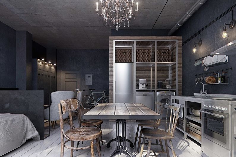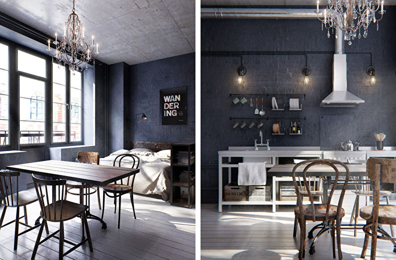 The loft style for interior decoration was chosen for a reason: it fits perfectly into the atmosphere of the attic and allows you to enter functional and practical details.