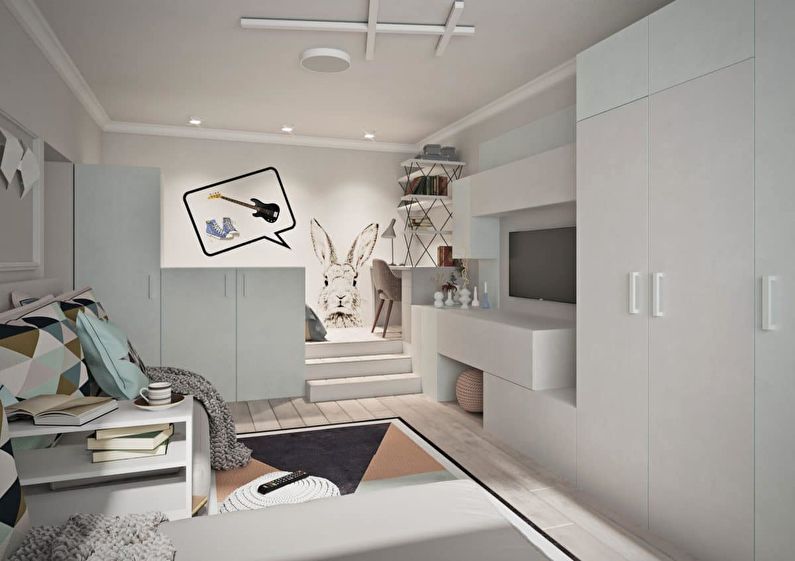 | Level | The perception of space is influenced by the complexity of the room. You can divide the territory by lowering the ceiling or raising the floor level. Allows you to create additional storage space. Only suitable for spacious apartments with high ceilings. |