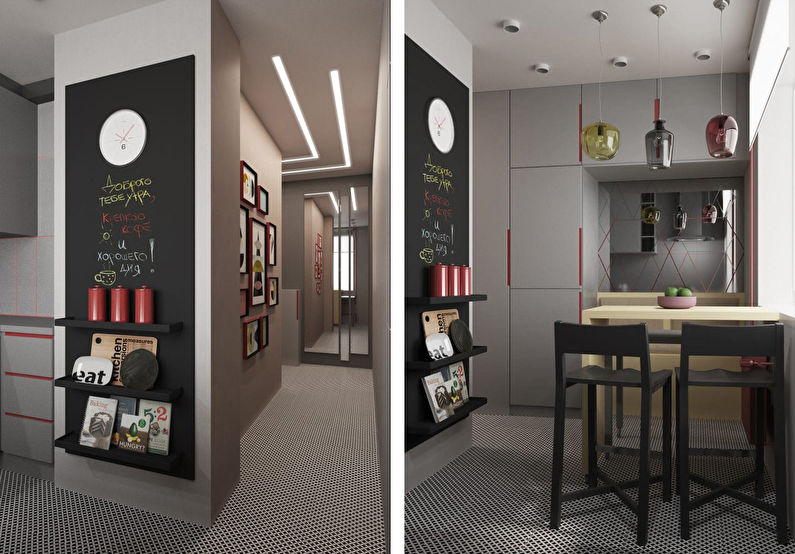 Set a multi-level light. Classical doors should be abandoned, replacing them with sliding ones as in sliding wardrobes. This will help to save meters. Place a convenient storage system in the hallway. For the kitchen, a set is suitable where you can build household appliances.