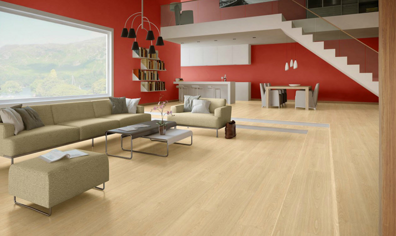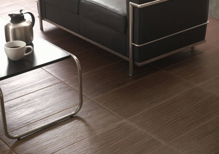 For the room in a modern style, various natural shades of the flooring are suitable: natural wood, cotton, quartz, glaze, sandy, almond