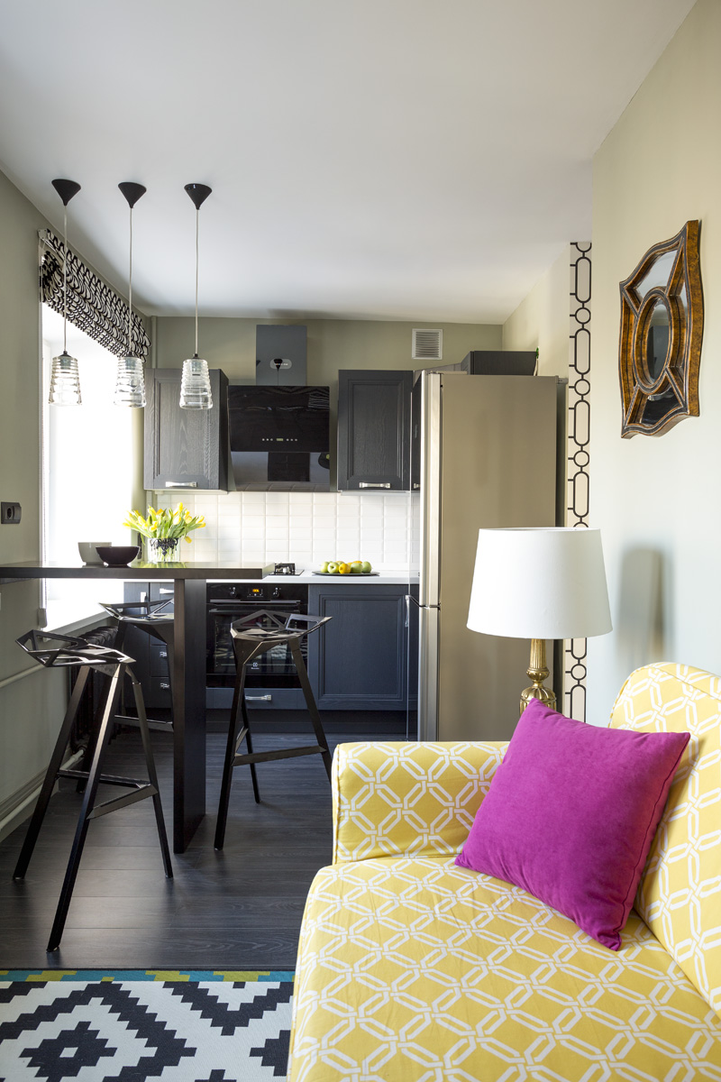 First rule small apartment design - light shades. They must be preferred both when choosing finishes and when buying furniture. To ensure that the room does not become faceless, it is necessary to dilute the light background with bright accents and dark inserts.