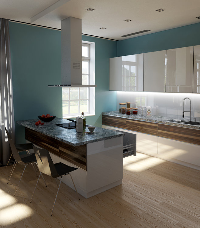 Instead of floor cabinets and shelving we use suspended modules. They do not occupy excess space and enliven the walls.