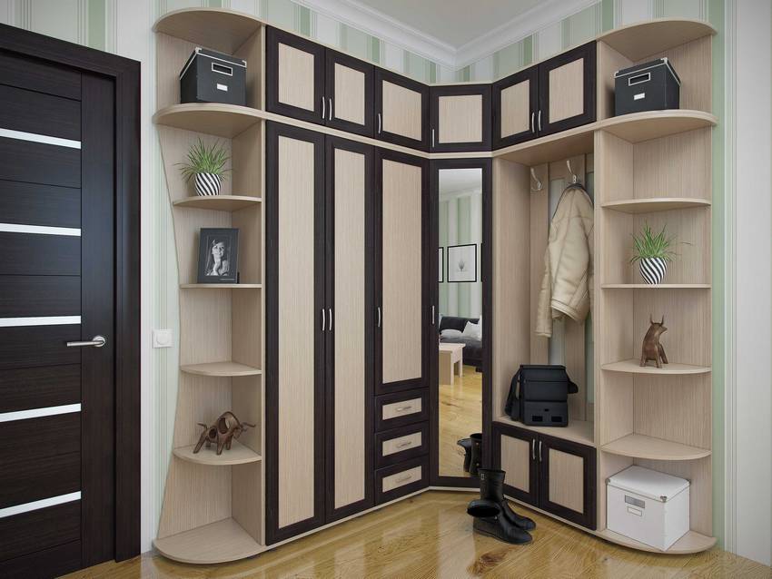 A key feature of the corner hallways is the layout. The design is carried out along curved lines, but should look like a single complex. If you correctly connect the necessary elements, the model will turn out convenient and roomy. It is important that the overall design is in harmony with the rest of the home. Then there will be a feeling of completeness.
