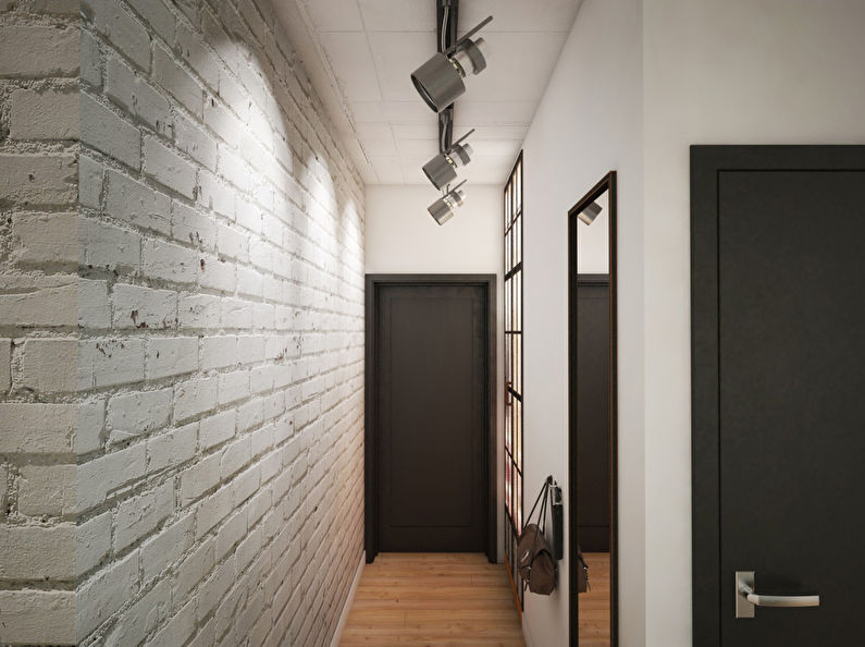 The choice should be based on rationality and practicality. Therefore, a spotlight is an excellent option. You can complement the room with elegant models of sconces. Organize natural light in the corridor will not work. Therefore, it is worth making the room as bright as possible using artificial light. In order not to aggravate the atmosphere and look, it is recommended to choose light and durable materials for decoration.