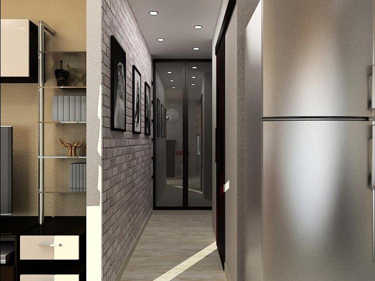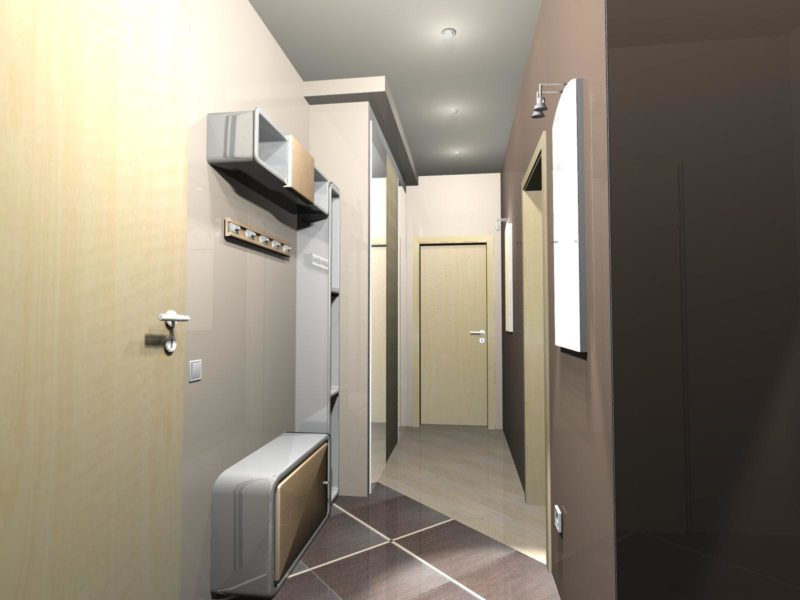 The wardrobe will only be at the end of the corridor, there is no other suitable place. An exception is a shallow built-in closet at one walk-through wall. It is better to equip it not with swing doors, but with sliding doors to occupy less space. The modern solution is the wardrobe department with internal diode illumination.