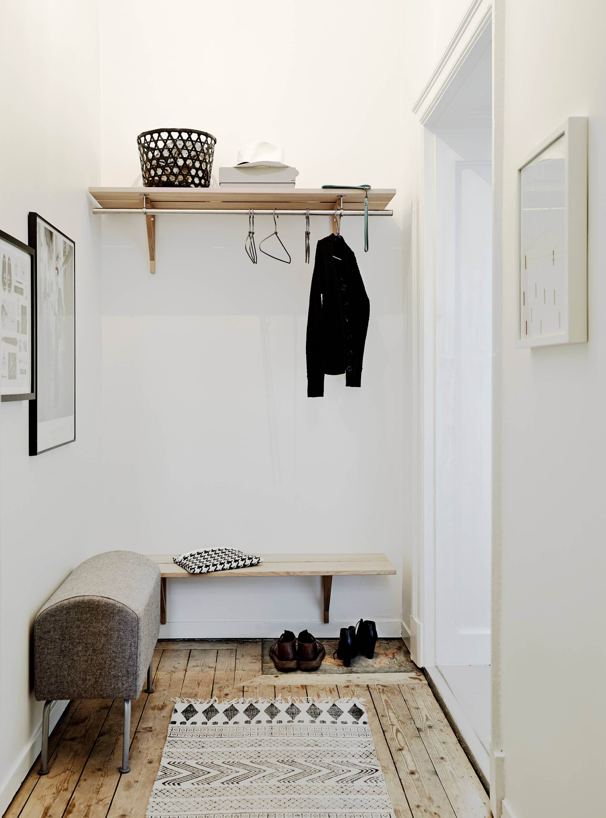 The narrow entrance hall can be adjusted by zoning with furniture, lighting, and decoration.