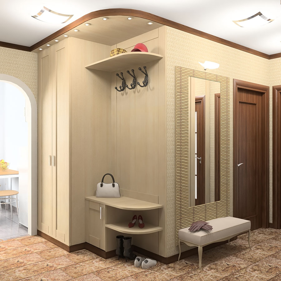 Cupboard. It is necessary to place outerwear and shoes. You can put on a wall and a hanger, but it is better if the clothes are hidden from prying eyes, so you get the most harmonious look. The most convenient view is a wardrobe. It does not take up much space, but it contains all the necessary elements for storing things.
