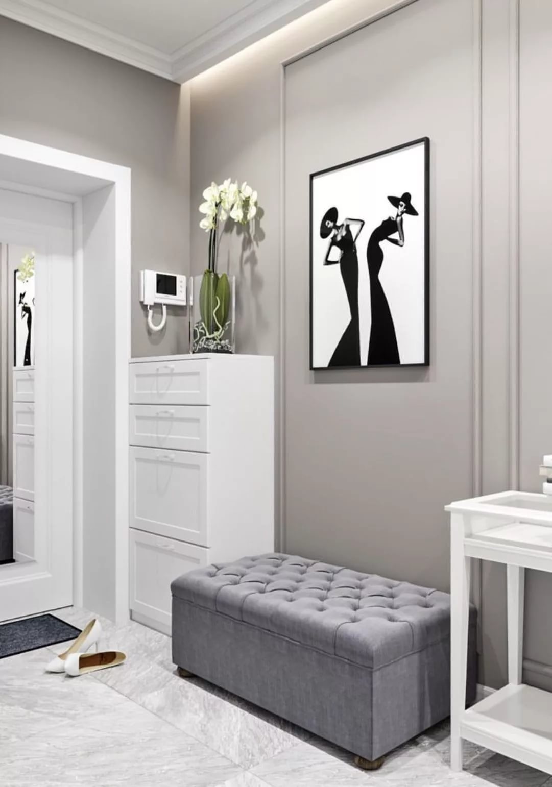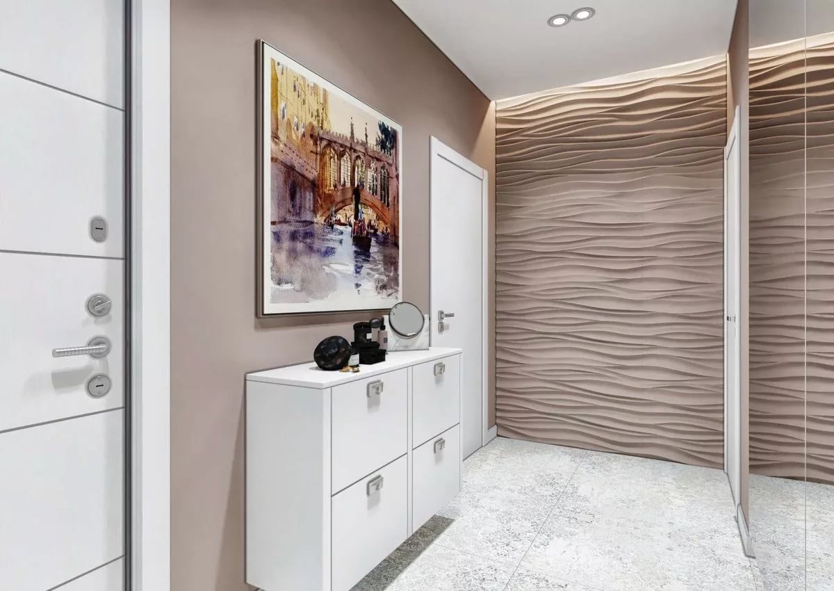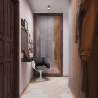 The combination of modernity and comfort. Such a hallway must be bright. Natural patterns, small floral prints, as well as natural shades will look organically.