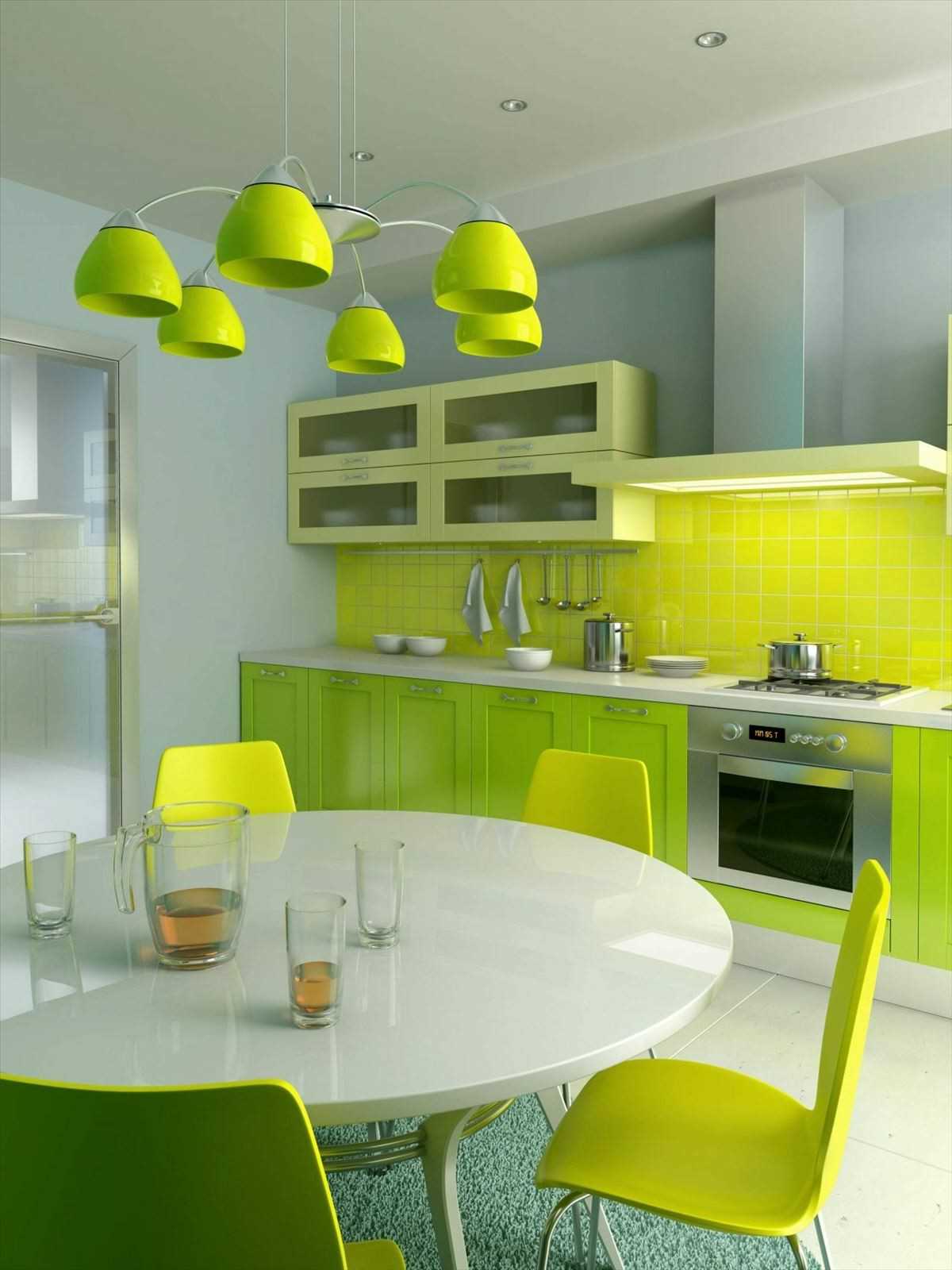 Different colors are used in cooking rooms. Gray elements and glossy surfaces complement the decor. Do not use blue color in the dining area. Looks great red, green tones, which cause appetite, have a positive effect on the digestion process.