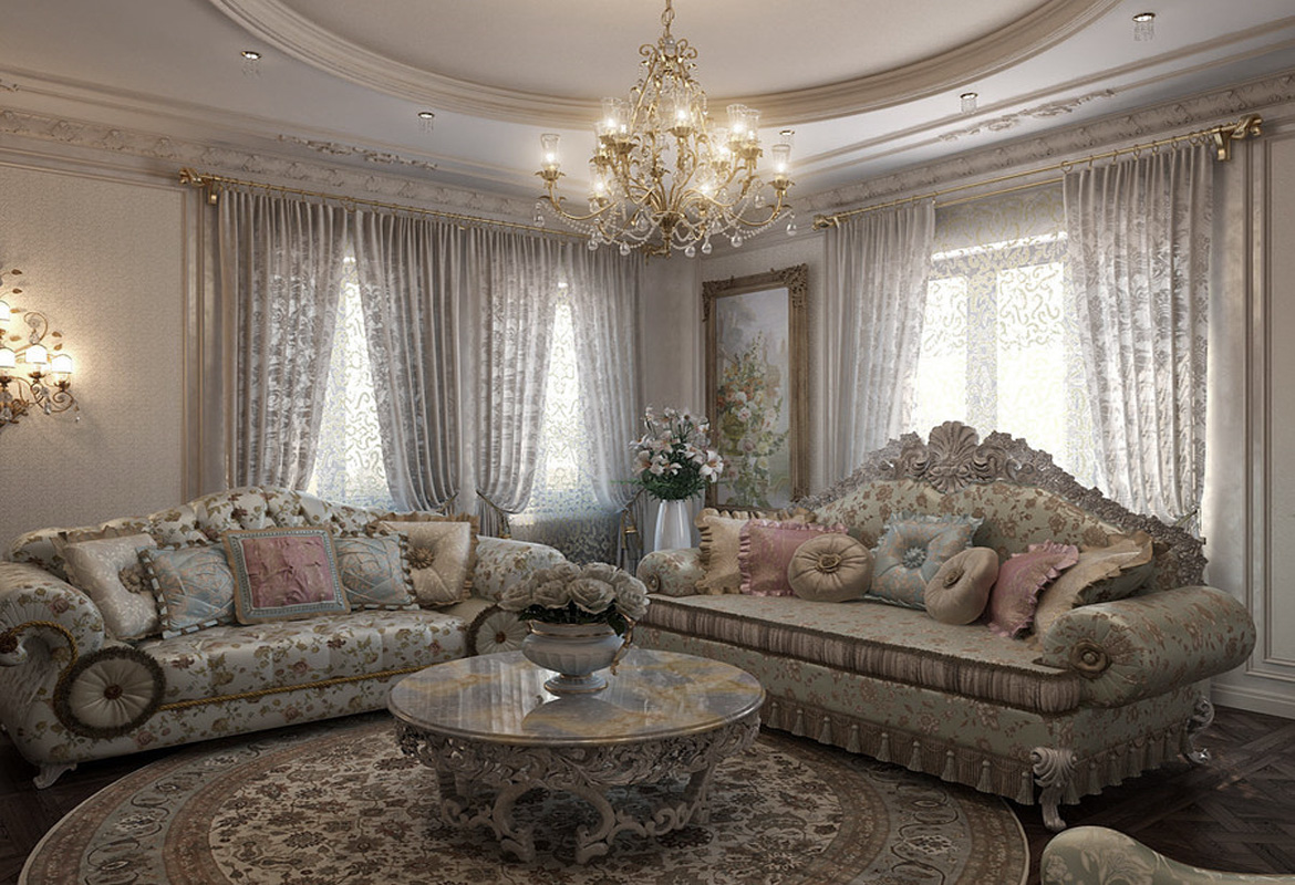 The baroque style living room is dominated by gold, burgundy and white shades. If the Rococo style was chosen, then the room should be dominated by pastel and feminine colors. The empire is characterized by some rigor in design. But from this he looks no less chic. It is recommended to supplement the empire with the help of medals, orders, armor.