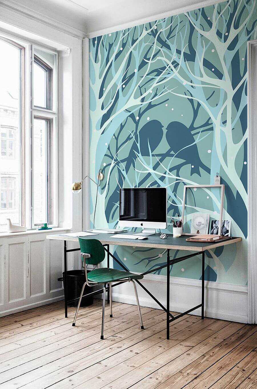 Using this background in the bedroom will create harmony. Icy notes will help to tone up and relax faster. For this purpose, combine it with gray, purple, green. Use black to highlight accents, dilute this coolness with soft-colored furniture, and a stylish harmonious interior for relaxation is ready.