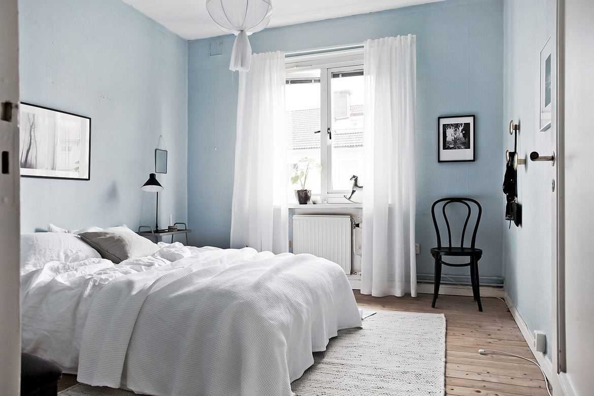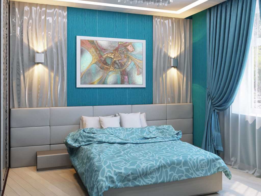 The blue color in the interior of the bedroom will create an atmosphere of calm