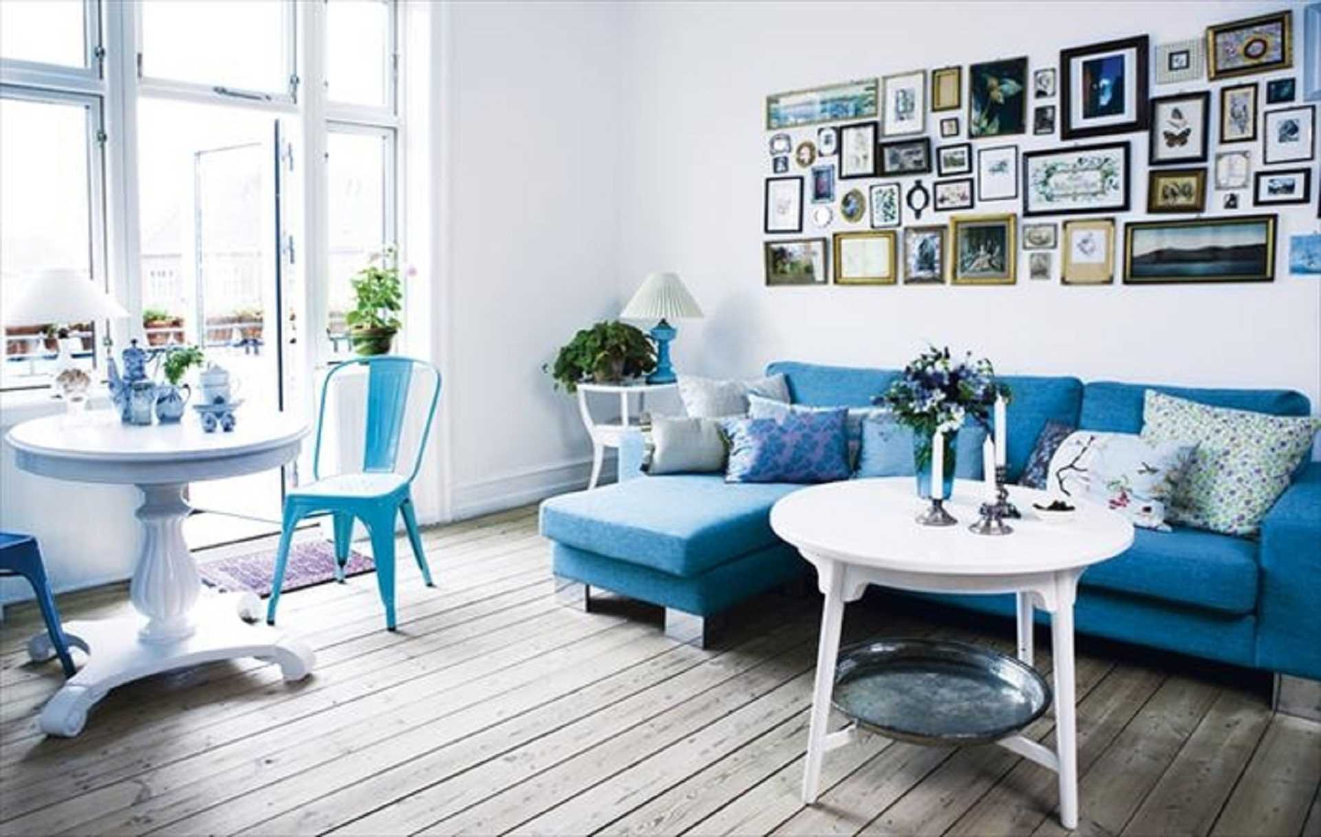 Want to create a harsh Scandinavian style in your living room? Use white paired with blue, add a little gray, and you're done. Love the vibrant and soft Mediterranean style? This topic will be central to the design of such an image. Dilute it with the appropriate accessories and get a peppy and delicate design.